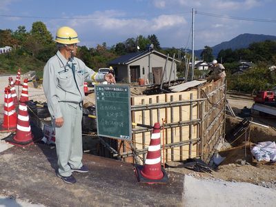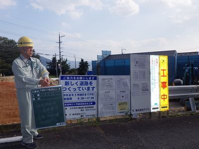 市道鳴川3号線道路改良工事現場の社内安全パトロールに同行してきました。 車が通りにくかった道路を通行しやすいように道路改良しています。この日は新しくできる道路の擁壁を作ったりしているところでした。今まであった道路を切断して危険になった箇所には目立つ色の防護網が設置されていてます。重機を使った作業など安全に施工されていました。ご安全に。。