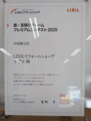 LIXILリフォームショップ 窓・玄関リフォーム プレミアムコンテスト2025! において、弊社が中国第2位‼を受賞したということで表彰して頂きました(*^^*) 2025年6月・7月・8月の窓・玄関の売上本数が2024年同時期よりも上まったという賞です (*^^*)